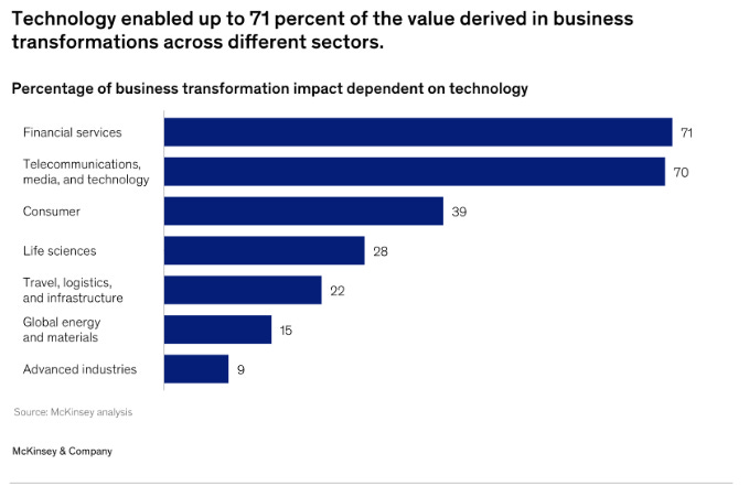 We all suspect that at some point in the past decade, software engineering became the rate limited factor not only for enterprise tech, but for business strategies in most corporations. How many new product launches, operational improvements or other strategic initiatives you know of don’t depend on new technology functionality? Back in 2023, some of my McKinsey colleagues demonstrated that, depending on sector, as much as 70 percent of the value in a business transformation might be technology-dependent. These numbers would be higher given the opportunities created by AI and agentic automation.